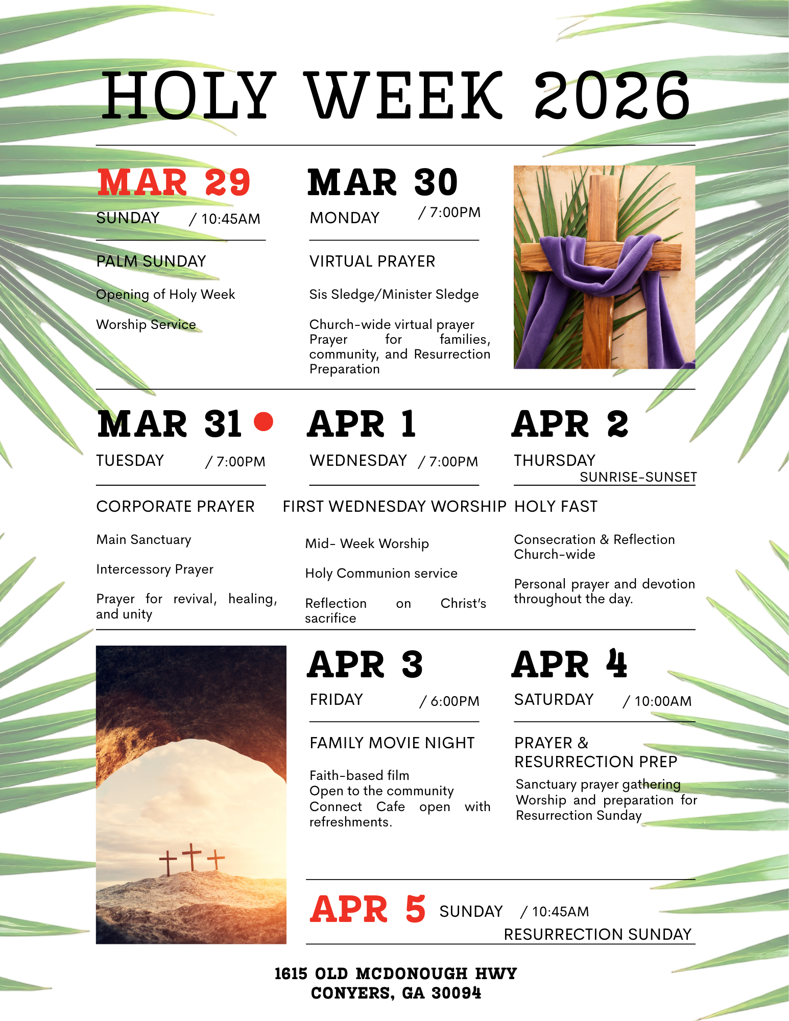 Victorious Life Church family, we invite you to join us as we observe Holy Week, beginning Sunday, March 29th through Sunday, April 5th. This will be a powerful week of worship, prayer, reflection, and celebration as we remember the sacrifice and resurrection of our Lord and Savior, Jesus Christ.